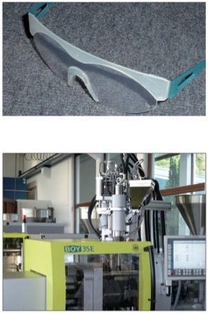 采用双成份注塑工艺生产的“安全防护镜”,使用的注塑机BOY 90E(锁模力900kN), 采用立式装配的注射单元。镜片和镜框部分采用高透明度的PP原材料。
